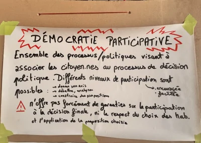 Pour clore la séquence d’ateliers, l’atelier « Organiser la démocratie participative dans sa commune – découvertes d’initiatives existantes et discussions » avait pour enjeu de découvrir plus concrètement comment mettre en place la démocratie directe et participative dans nos communes. Nous avons découvert et présenté 8 outils/instances utilisées actuellement par de nombreuses communes : l’assemblée citoyenne, le budget participatif, les commissions ouvertes aux habitant.es, le conseil de quartier et le conseil des jeunes, l’observatoire de la démocratie, et le groupe de coordination ouvert aux habitant.es .