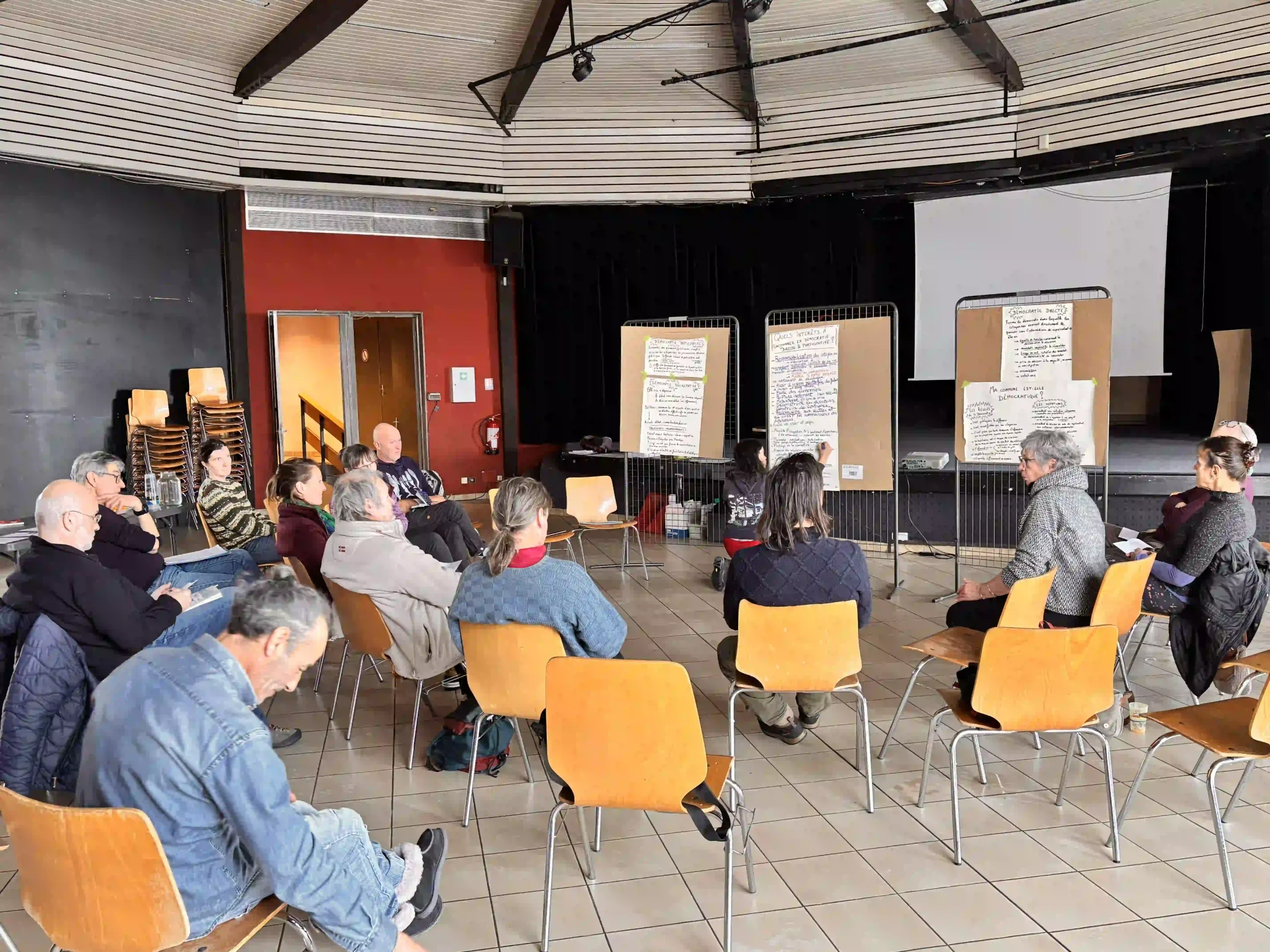 A 13h, après un buffet partagé, nous nous sommes retrouvé.es pour l’atelier « Pourquoi faire de la démocratie participative localement ? » qui nous a permis de réfléchir aux intérêts de la démocratie directe, participative et délibérative. Les idées ont fusé montrant les multiples avantages de ce système, corroborées par de nombreux témoignages dans les communes qui l’expérimentent deja. Quelques exemples concrets de mise en œuvre de démocratie directe ont été cités et des témoignages partagés.